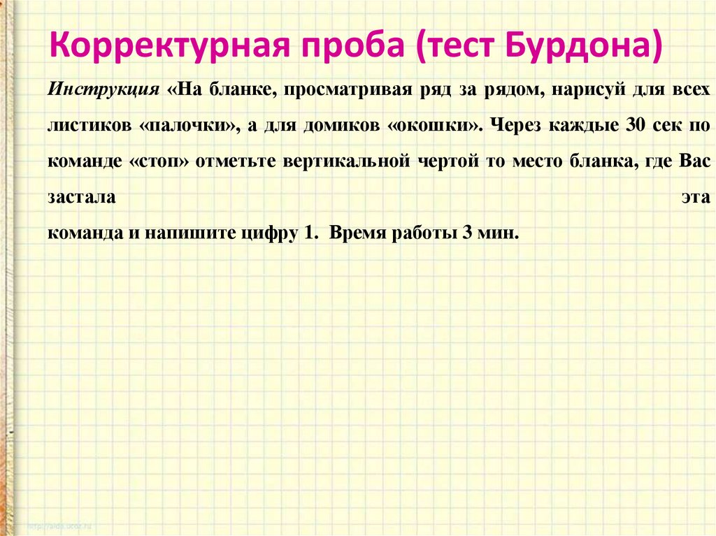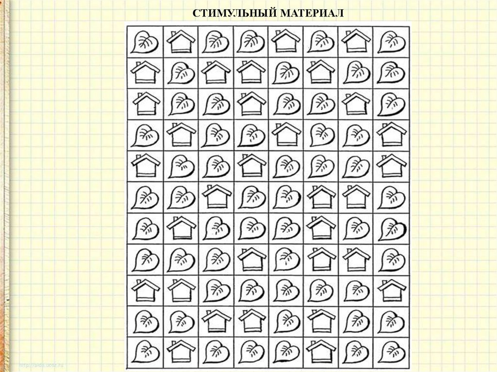 Корректурная проба (тест Бурдона)Инструкция «На бланке, просматривая ряд за рядом, нарисуй для всех