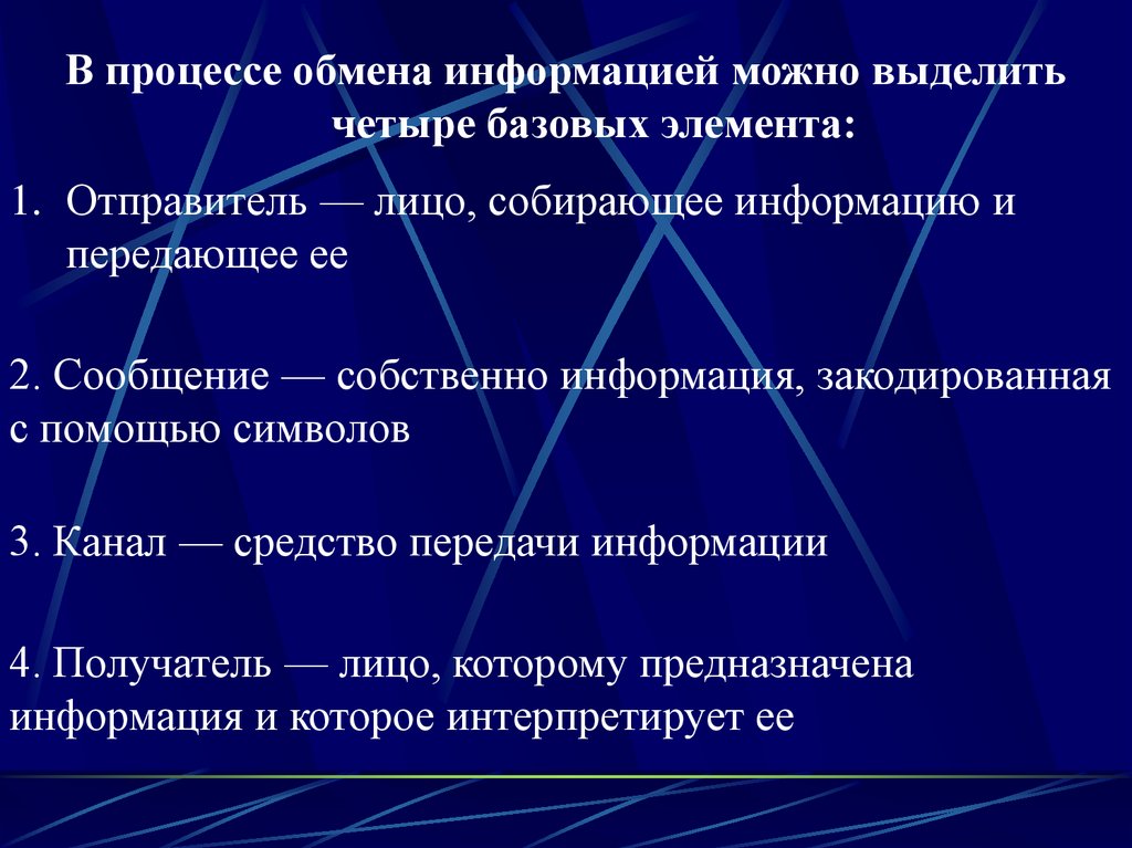 В процессе обмена информацией можно выделитьчетыре базовых элемента: