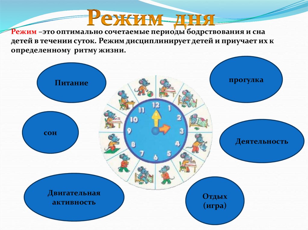 Режим –это оптимально сочетаемые периоды бодрствования и снадетей в течении суток. Режим дисциплинирует детей и приучает их к