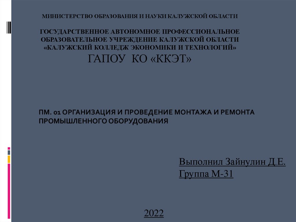 ПМ. 01 ОРГАНИЗАЦИЯ И ПРОВЕДЕНИЕ МОНТАЖА И РЕМОНТА