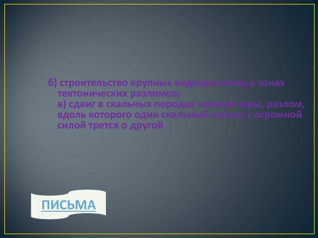 б) строительство крупных водохранилищ в зонахтектонических разломов;