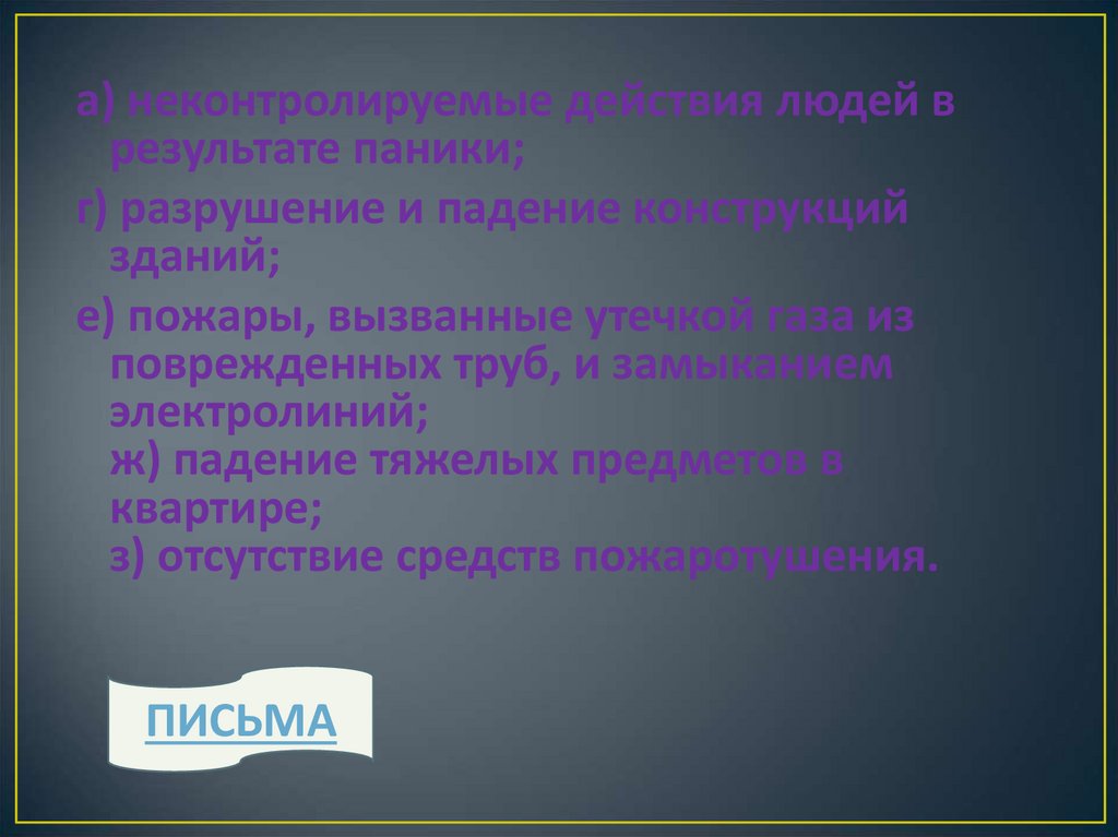 12. Основными причинами несчастных случаев при землетрясениях являются: а) неконтролируемые действия людей в результате паники; б)