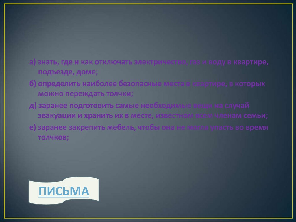 а) отключить электричество, газ, воду;д) отойти от окон и предметов мебели, которые могут упасть.