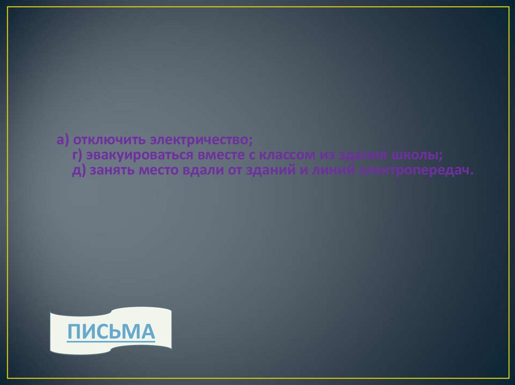 а) отключить электричество;г) эвакуироваться вместе с классом из здания школы;