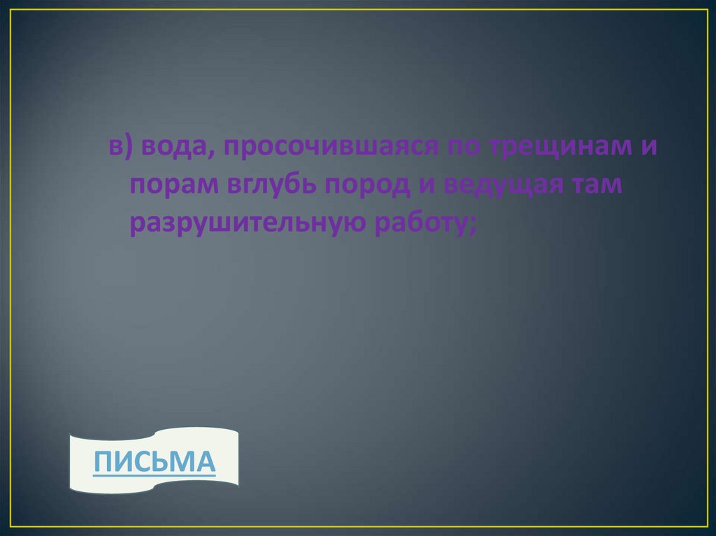в) вода, просочившаяся по трещинам ипорам вглубь пород и ведущая там
