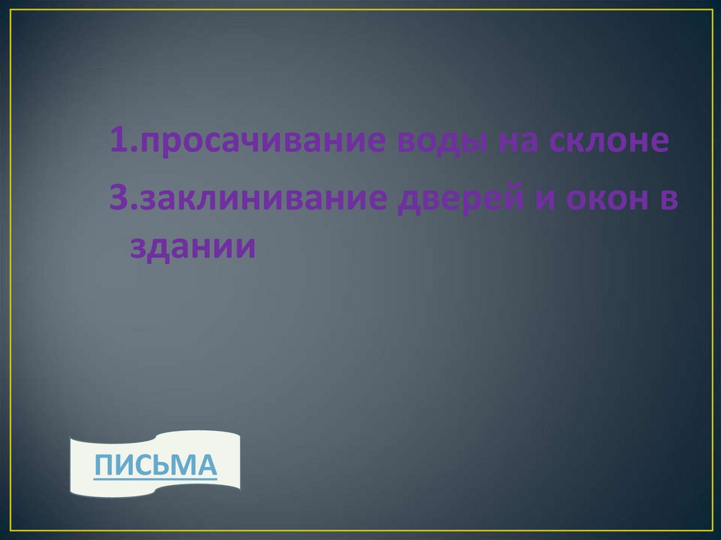 1.просачивание воды на склоне3.заклинивание дверей и окон в