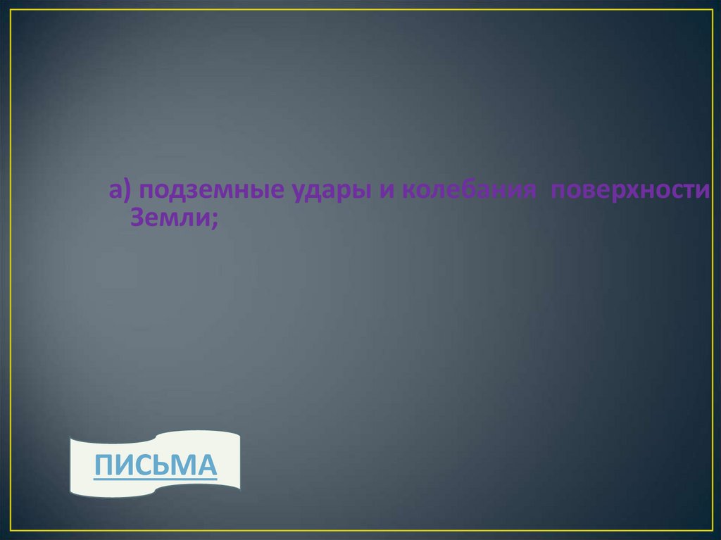 8. Что такое землетрясение? Укажите правильный ответ. а) подземные удары и колебания поверхности Земли; б) область возникновения