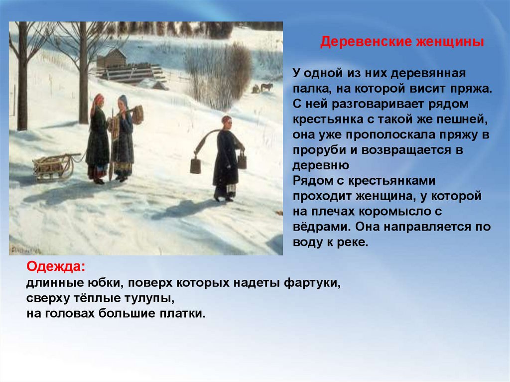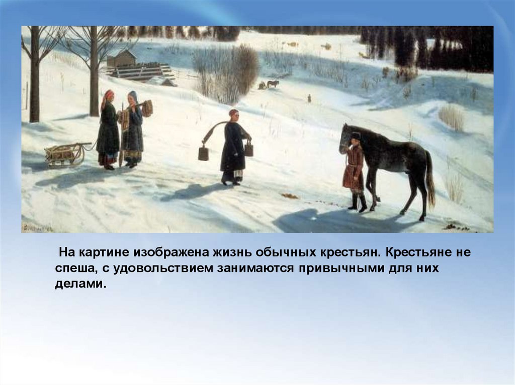 На картине изображена жизнь обычных крестьян. Крестьяне неспеша, с удовольствием занимаются привычными для них