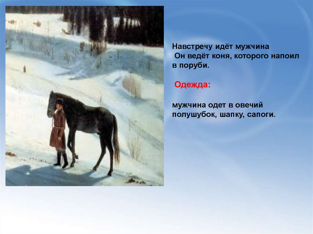 Навстречу идёт мужчинаОн ведёт коня, которого напоил