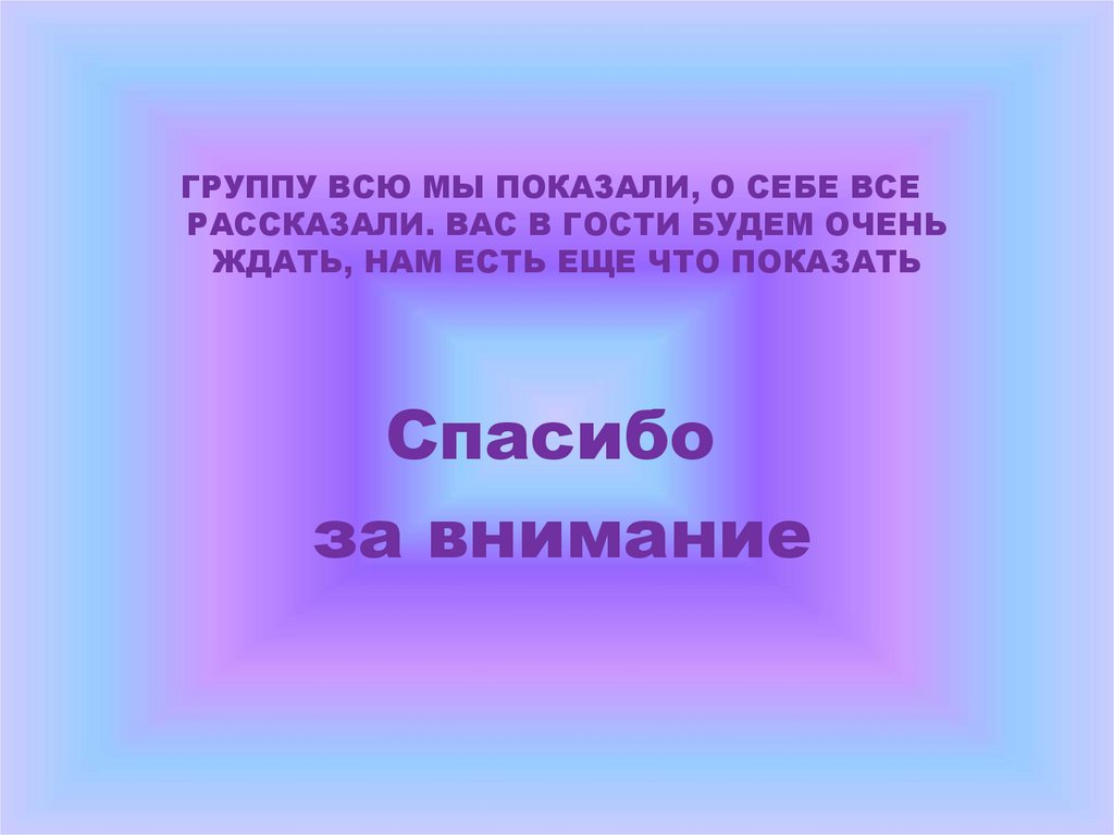 ГРУППУ ВСЮ МЫ ПОКАЗАЛИ, О СЕБЕ ВСЕРАССКАЗАЛИ. ВАС В ГОСТИ БУДЕМ ОЧЕНЬ
