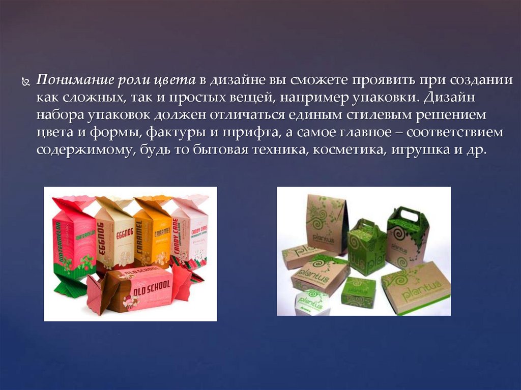 Понимание роли цвета в дизайне вы сможете проявить при созданиикак сложных, так и простых вещей, например упаковки. Дизайн