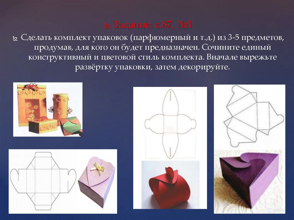 Задание: с.87, №1Сделать комплект упаковок (парфюмерный и т.д.) из 3-5 предметов,
