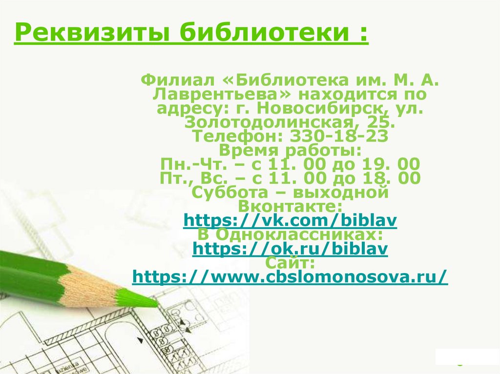 Реквизиты библиотеки :Филиал «Библиотека им. М. А.