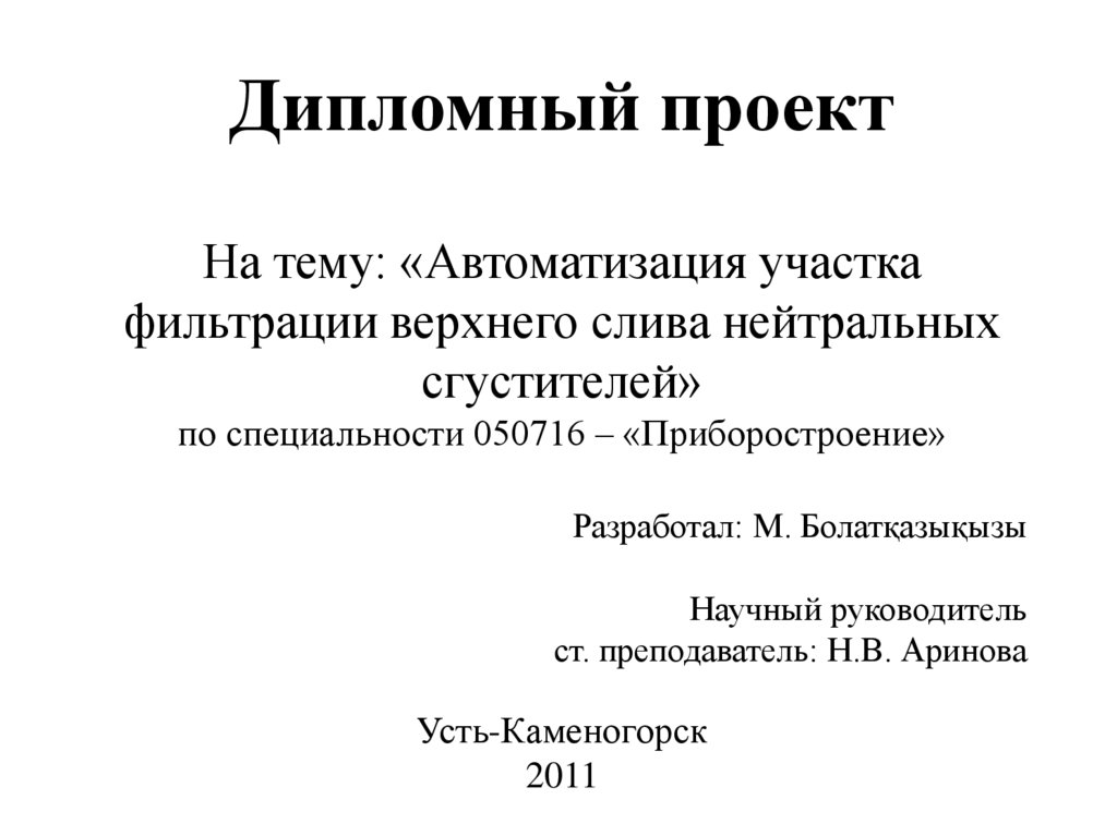 1. Дипломный проект На тему: «Автоматизация участка фильтрации верхнего слива нейтральных сгустителей» по специальности 050716 –