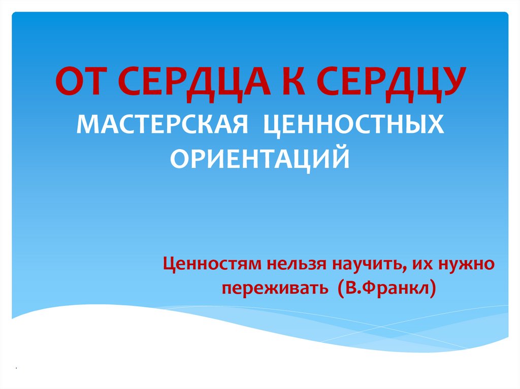 1. ОТ СЕРДЦА К СЕРДЦУ МАСТЕРСКАЯ ЦЕННОСТНЫХ ОРИЕНТАЦИЙ