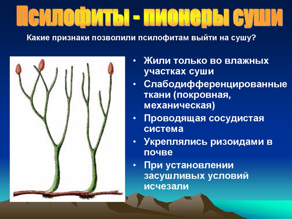 Какие признаки позволили псилофитам выйти на сушу?• Жили только во влажных