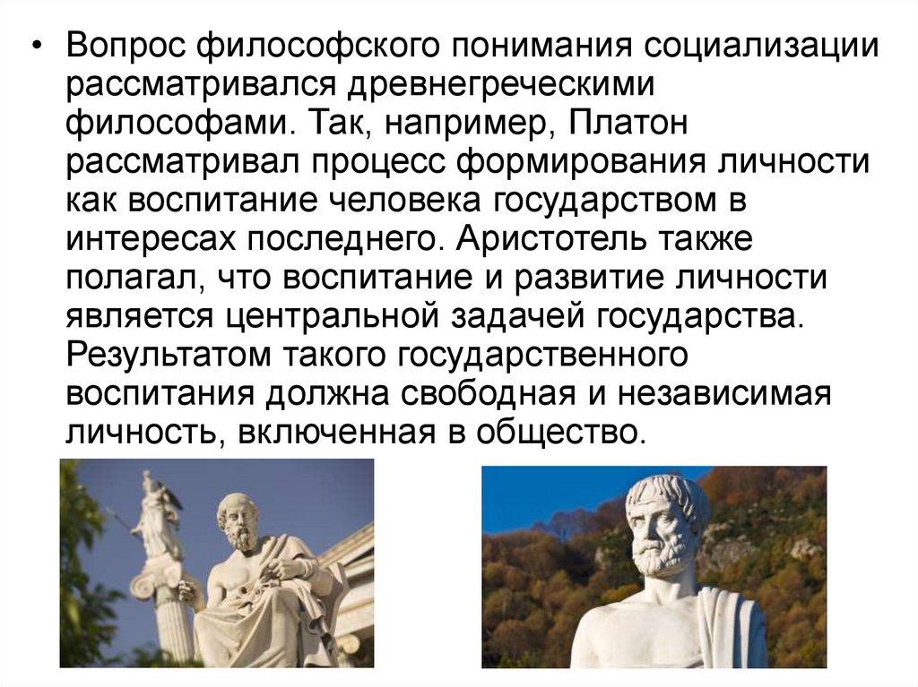 • Вопрос философского понимания социализациирассматривался древнегреческими