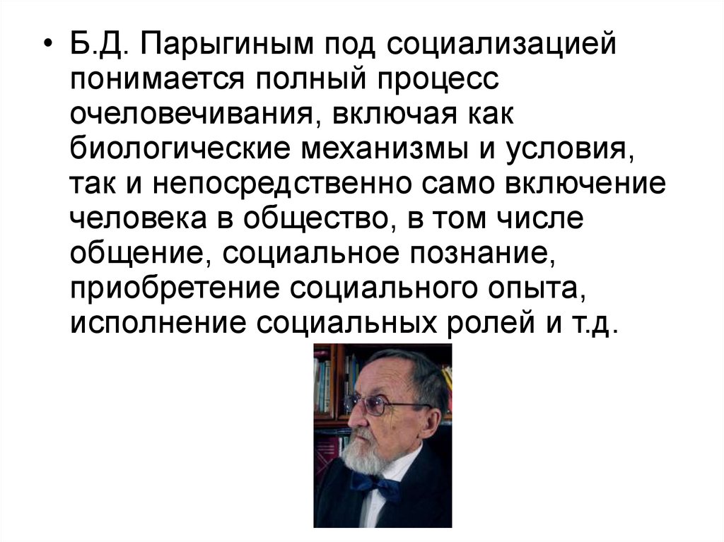 • Б.Д. Парыгиным под социализациейпонимается полный процесс