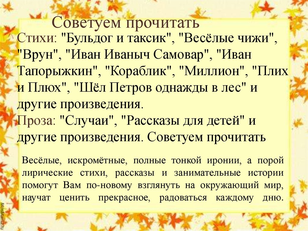 Советуем прочитатьСтихи: "Бульдог и таксик", "Весёлые чижи",