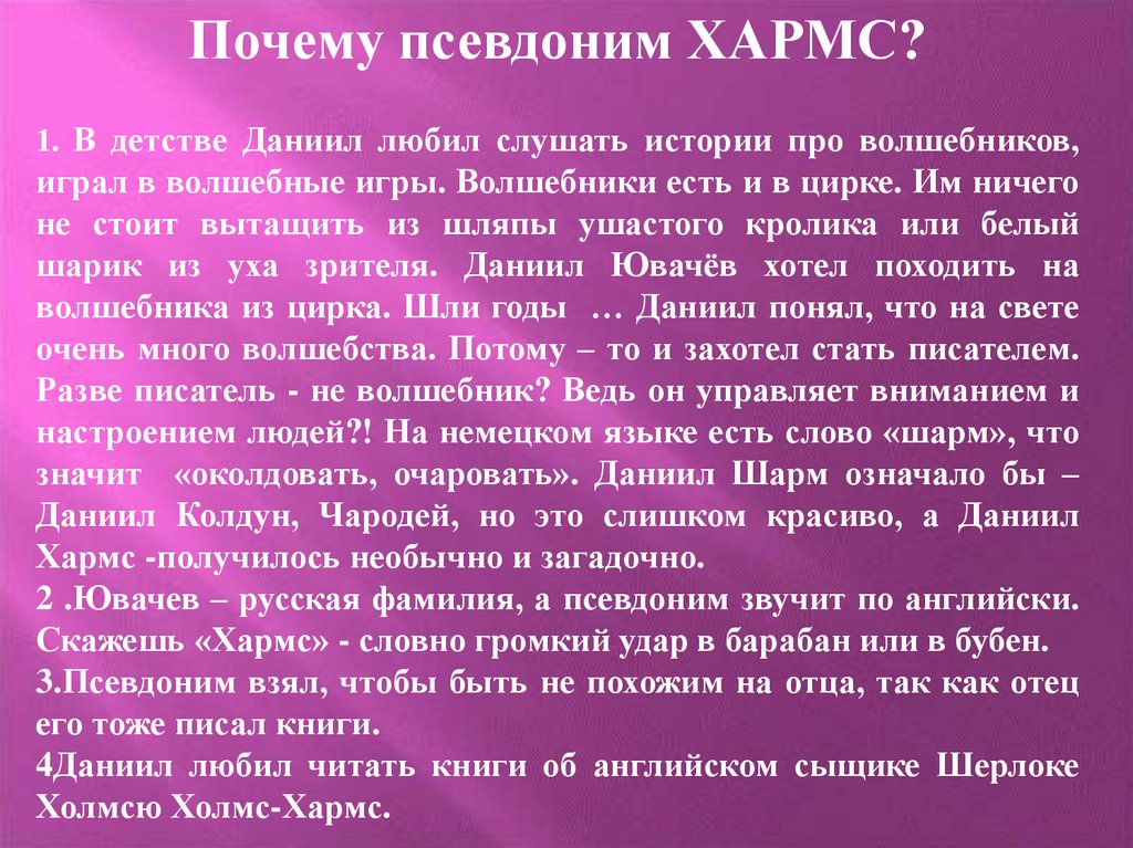 Почему псевдоним ХАРМС?1. В детстве Даниил любил слушать истории про волшебников,