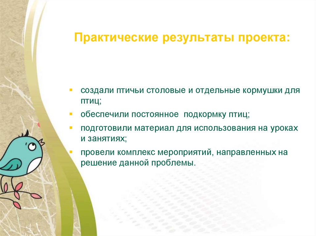 Практические результаты проекта:создали птичьи столовые и отдельные кормушки для