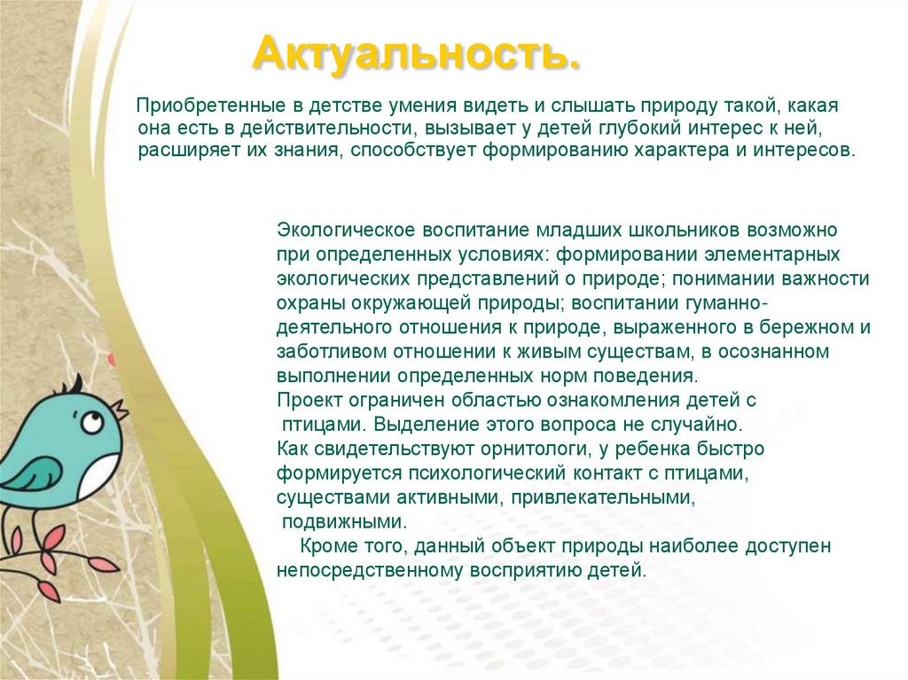 Актуальность.Приобретенные в детстве умения видеть и слышать природу такой, какая