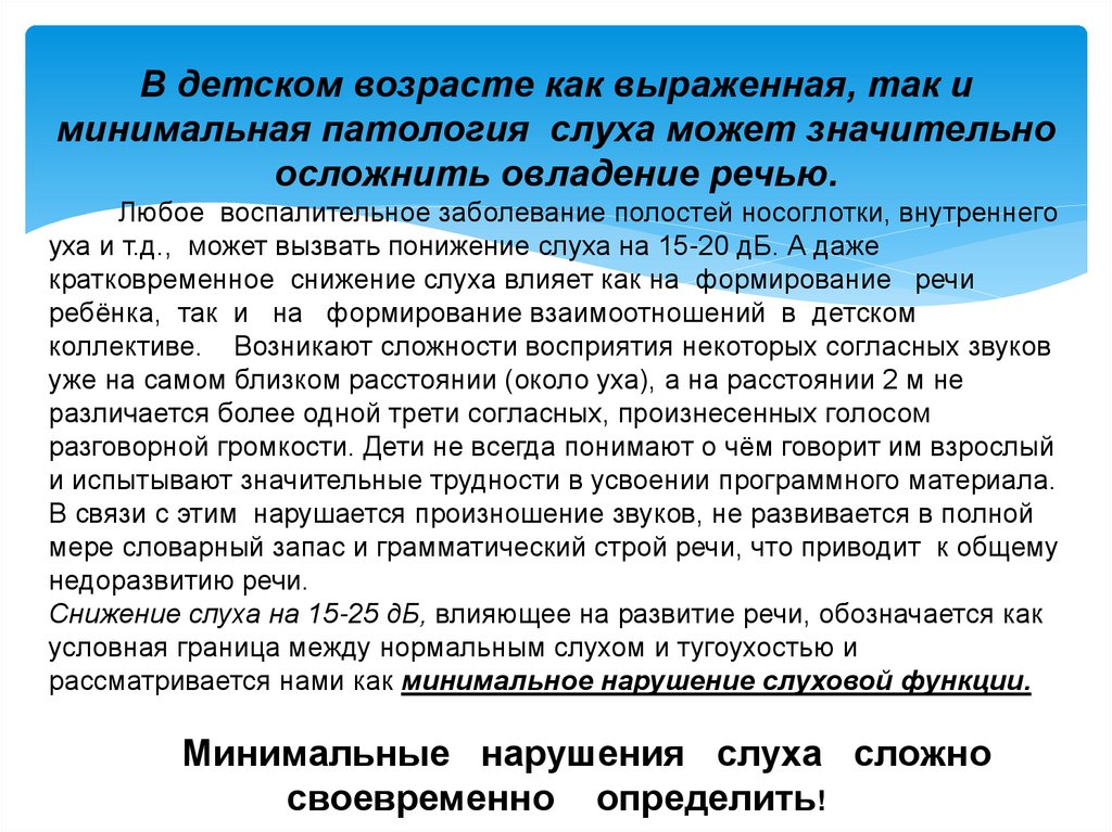 В детском возрасте как выраженная, так иминимальная патология слуха может значительно
