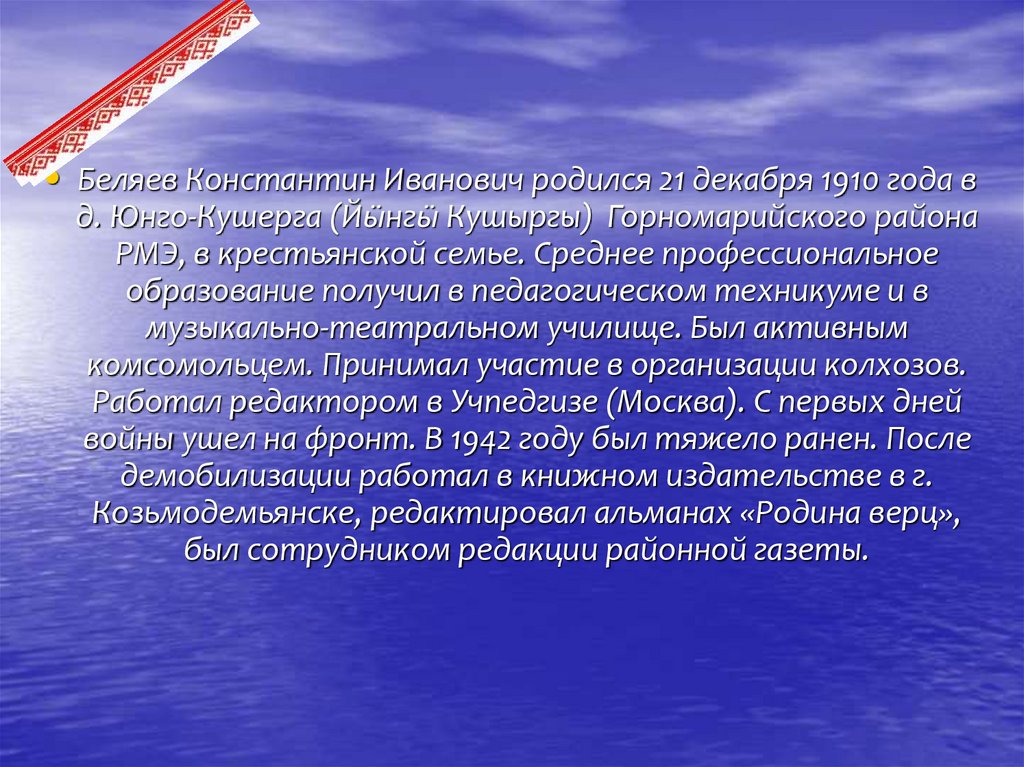 • Беляев Константин Иванович родился 21 декабря 1910 года вд. Юнго-Кушерга (Йӹнгӹ Кушыргы) Горномарийского района