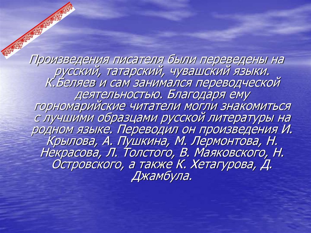 Произведения писателя были переведены нарусский, татарский, чувашский языки.