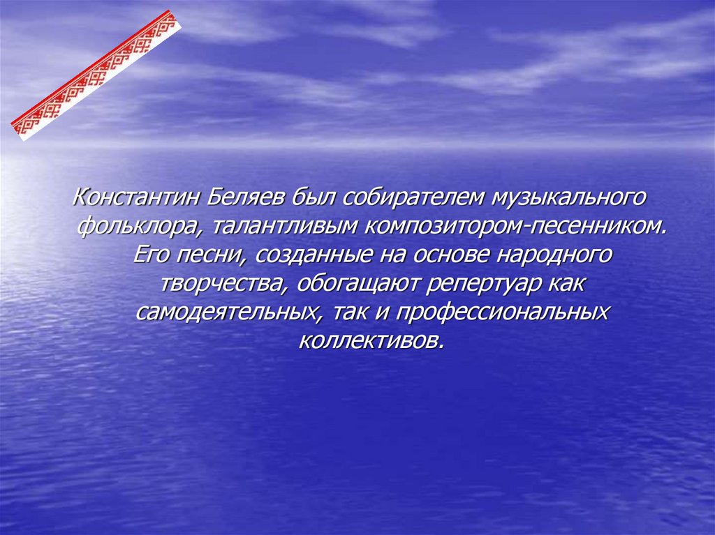 Константин Беляев был собирателем музыкальногофольклора, талантливым композитором-песенником.