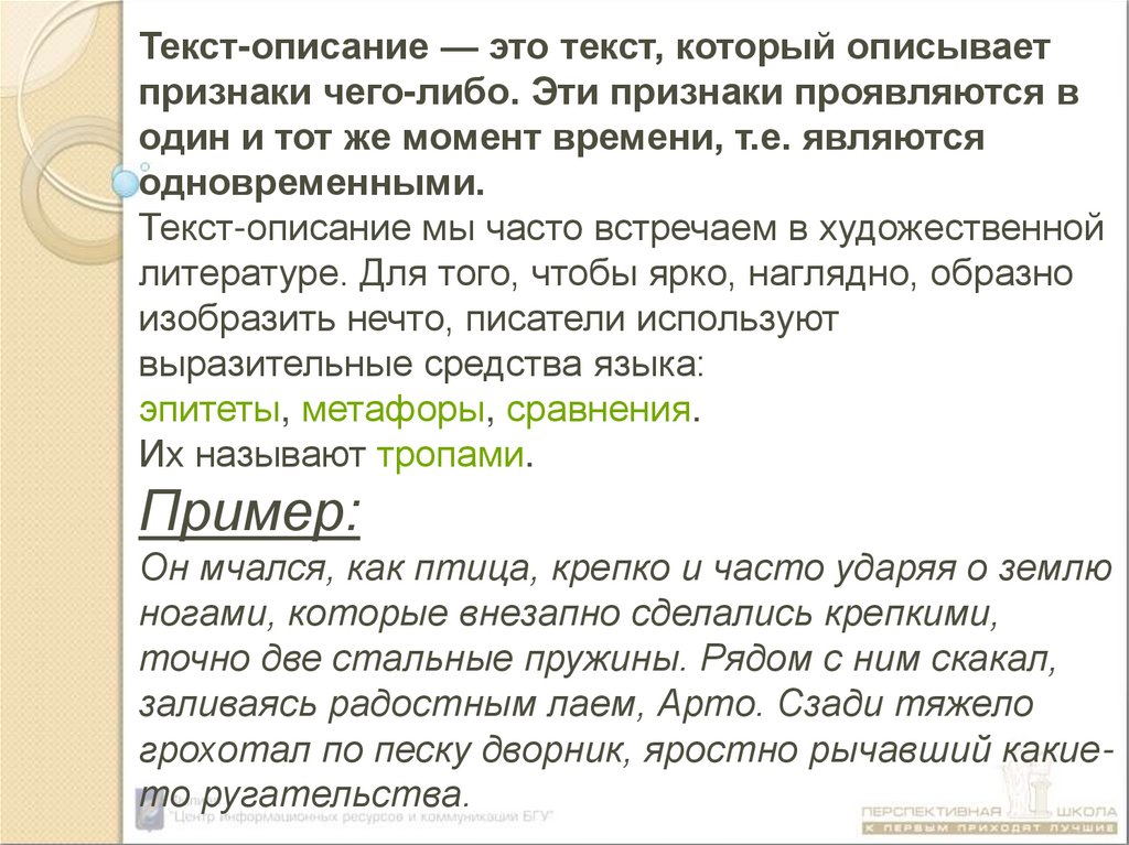 Текст-описание — это текст, который описываетпризнаки чего-либо. Эти признаки проявляются в