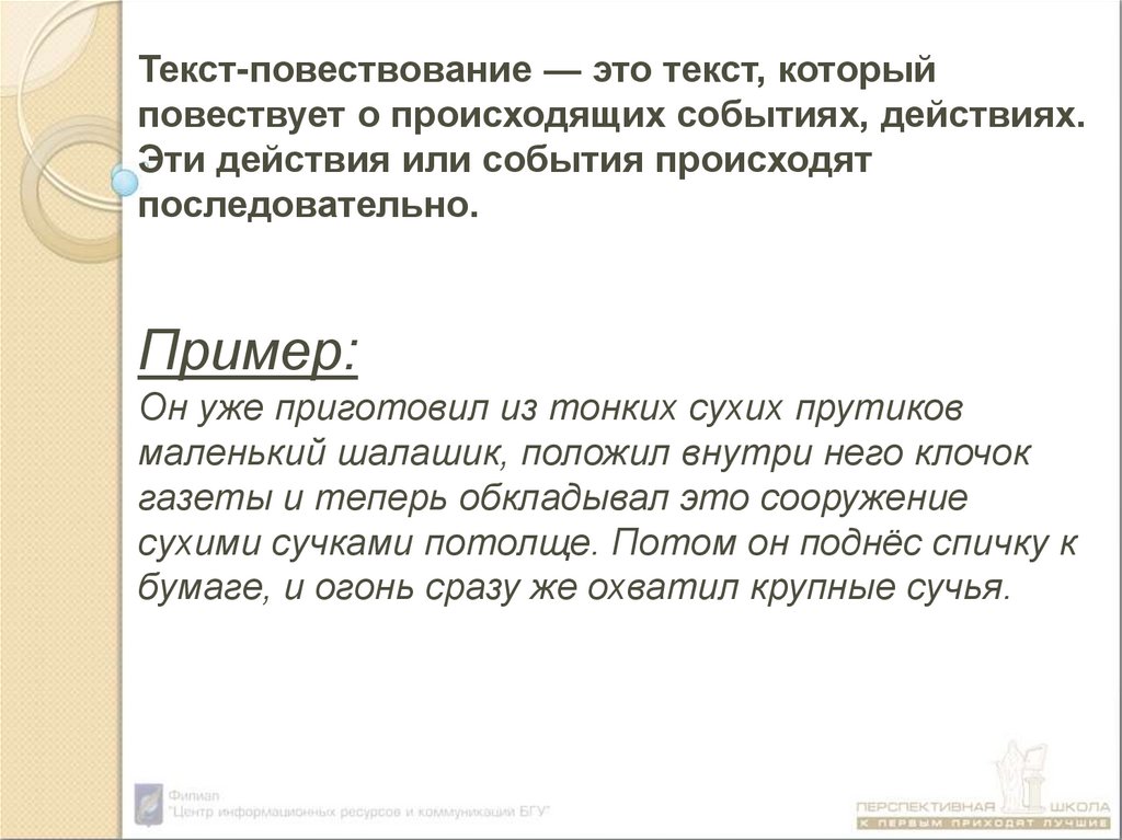 Текст-повествование — это текст, которыйповествует о происходящих событиях, действиях.