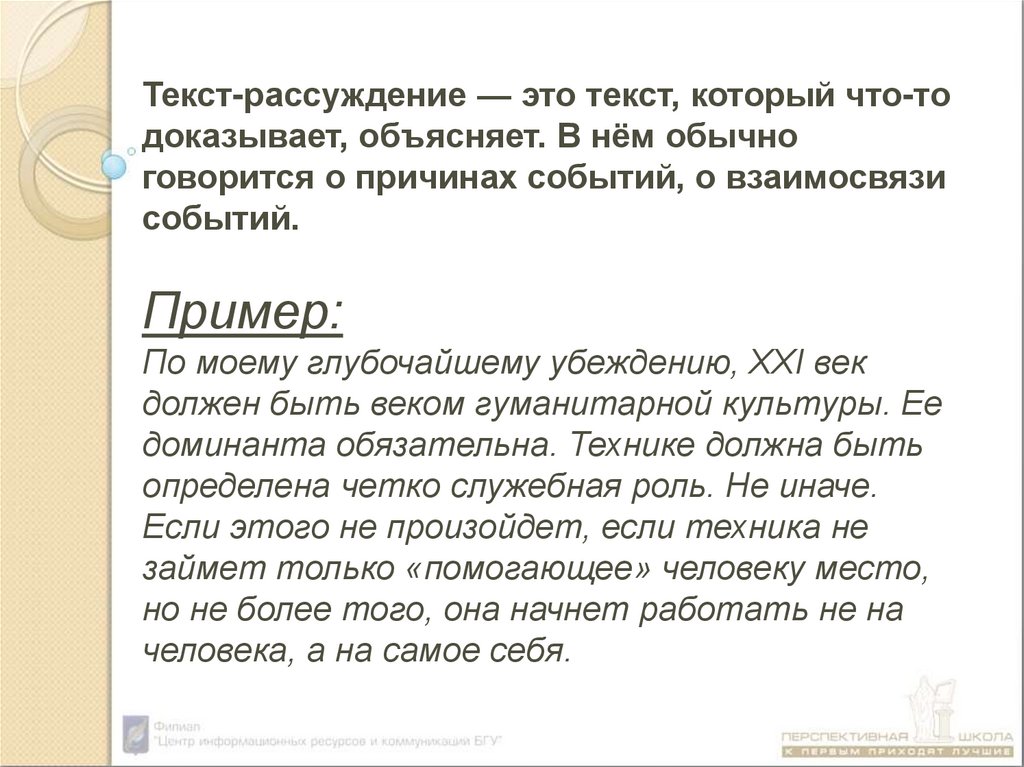 Текст-рассуждение — это текст, который что-тодоказывает, объясняет. В нём обычно