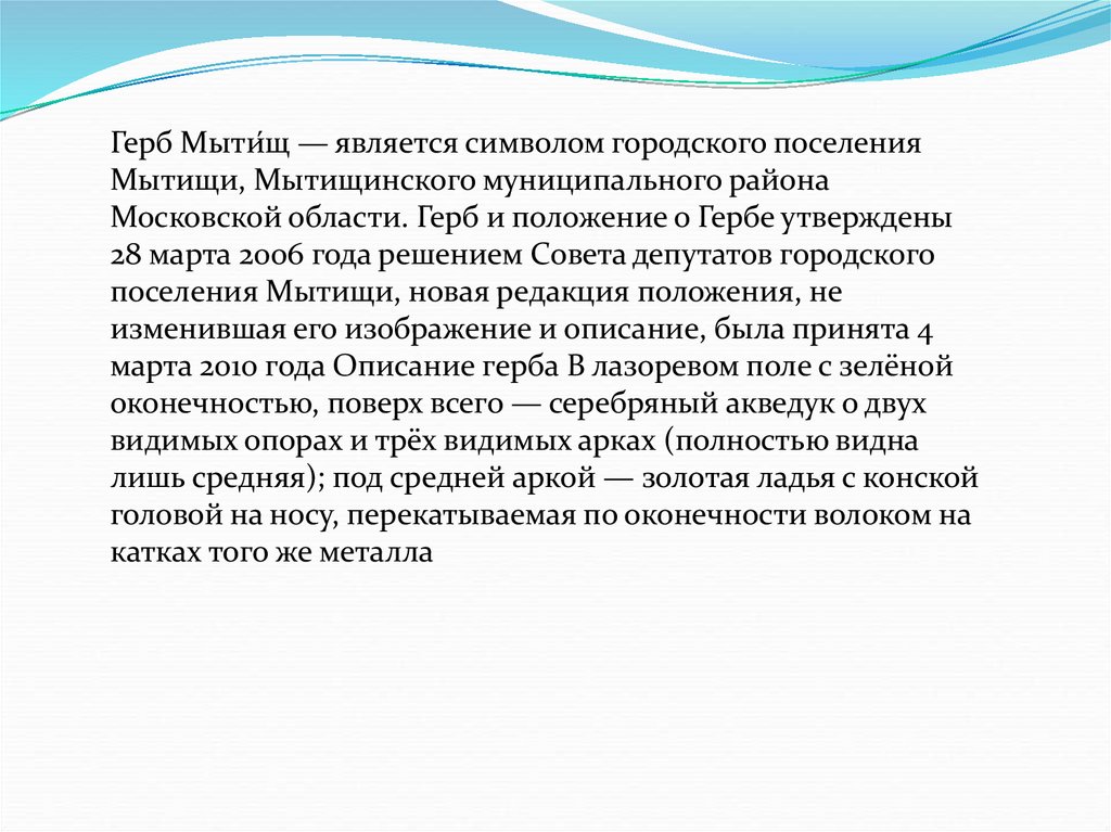 Герб Мыти́щ — является символом городского поселенияМытищи, Мытищинского муниципального района