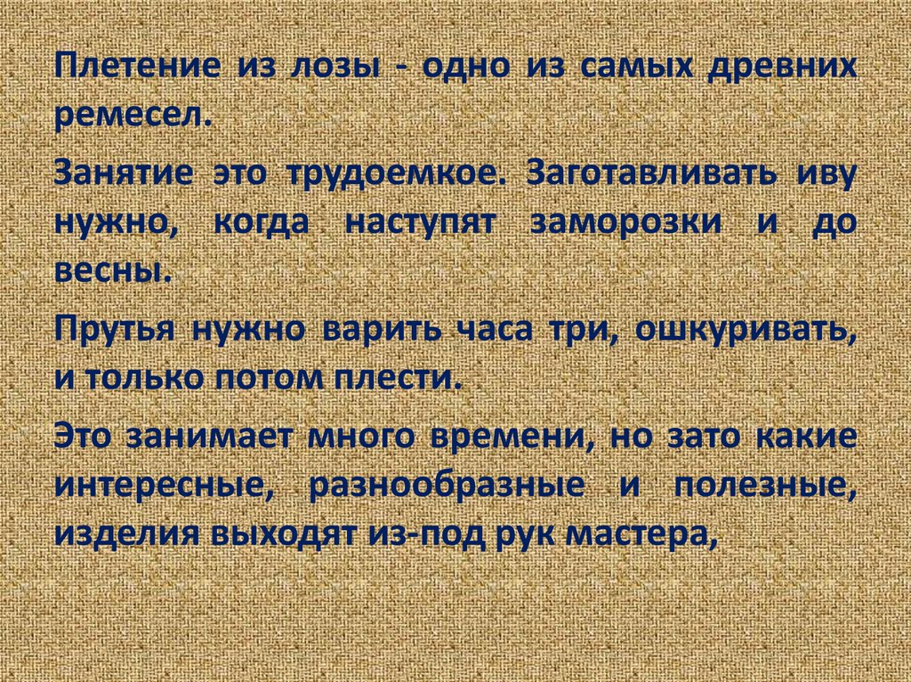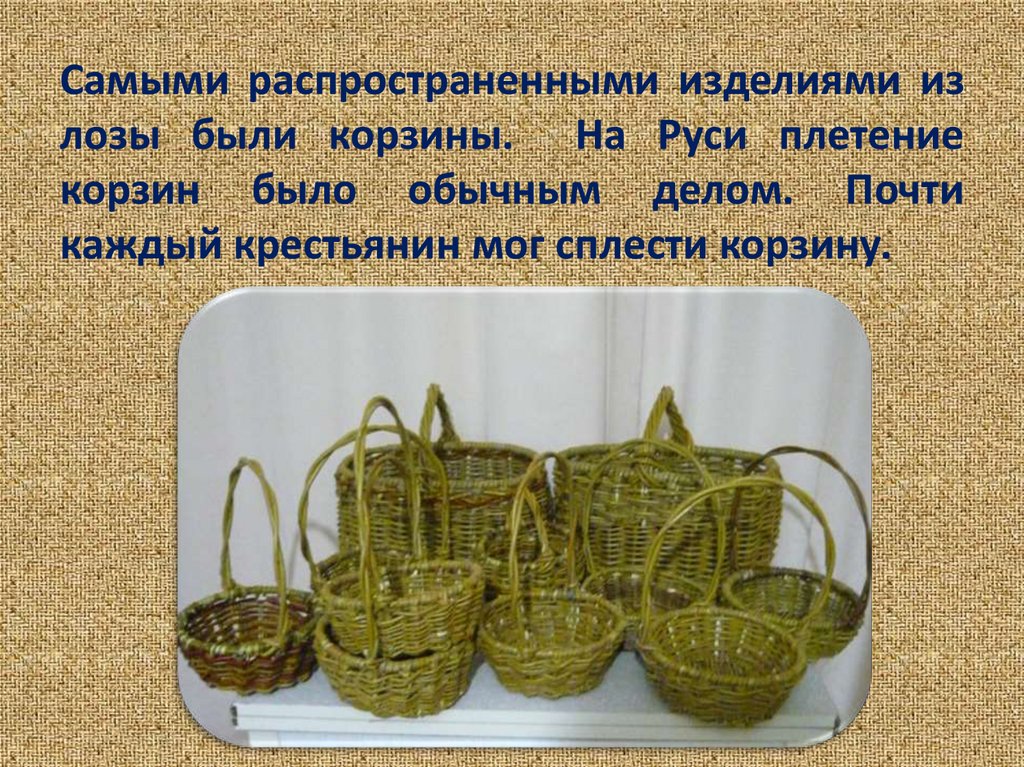 Самыми распространенными изделиями излозы были корзины. На Руси плетение