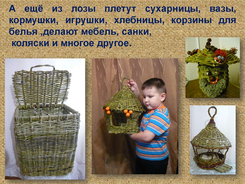 А ещё из лозы плетут сухарницы, вазы,кормушки, игрушки, хлебницы, корзины для