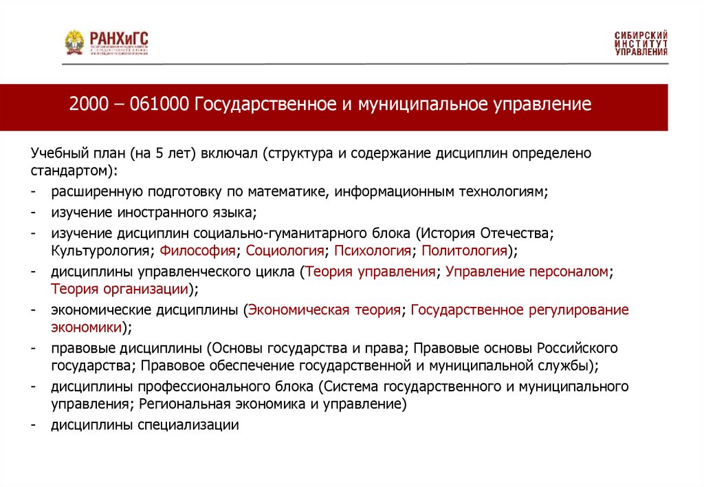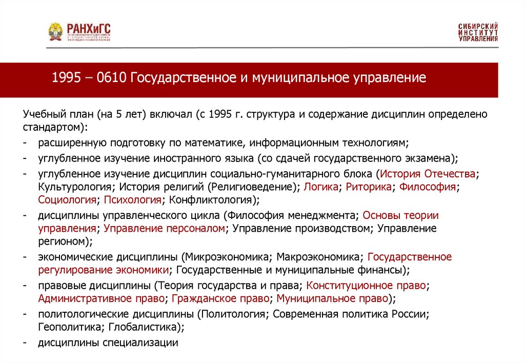 1995 – 0610 Государственное и муниципальное управлениеУчебный план (на 5 лет) включал (с 1995 г. структура и содержание дисциплин определено