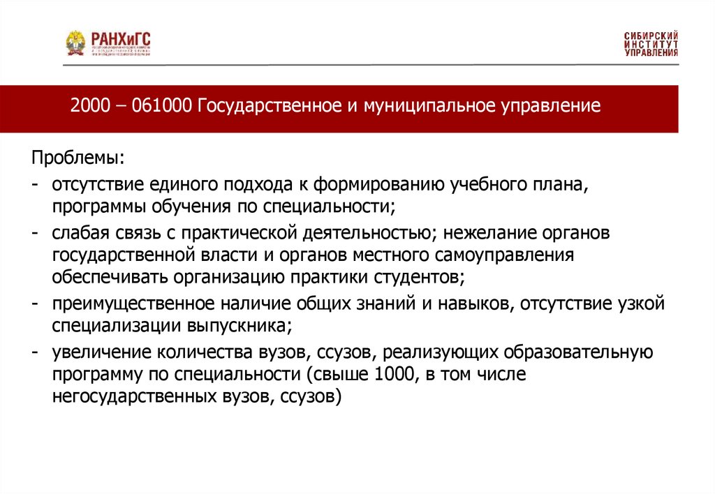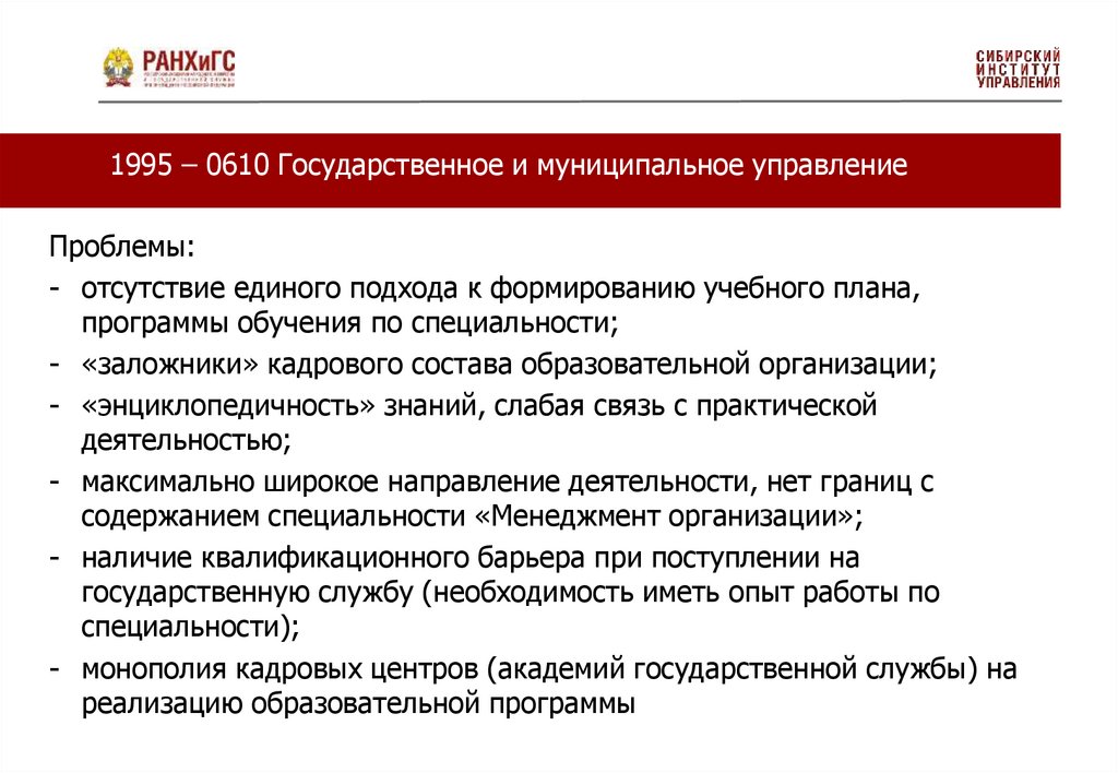 1995 – 0610 Государственное и муниципальное управлениеПроблемы: