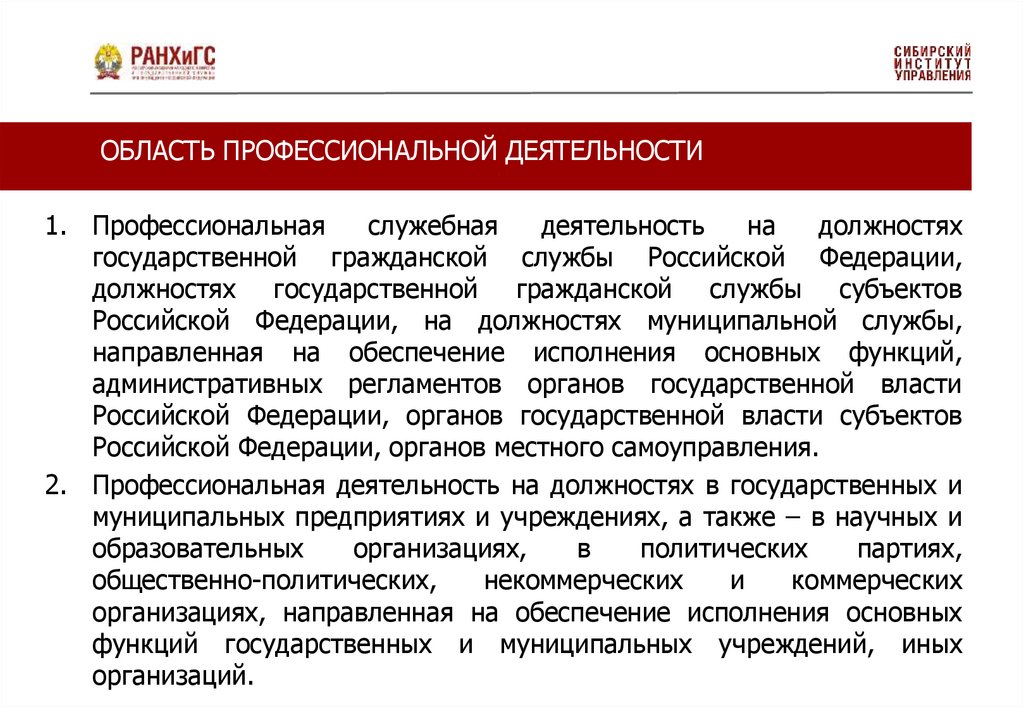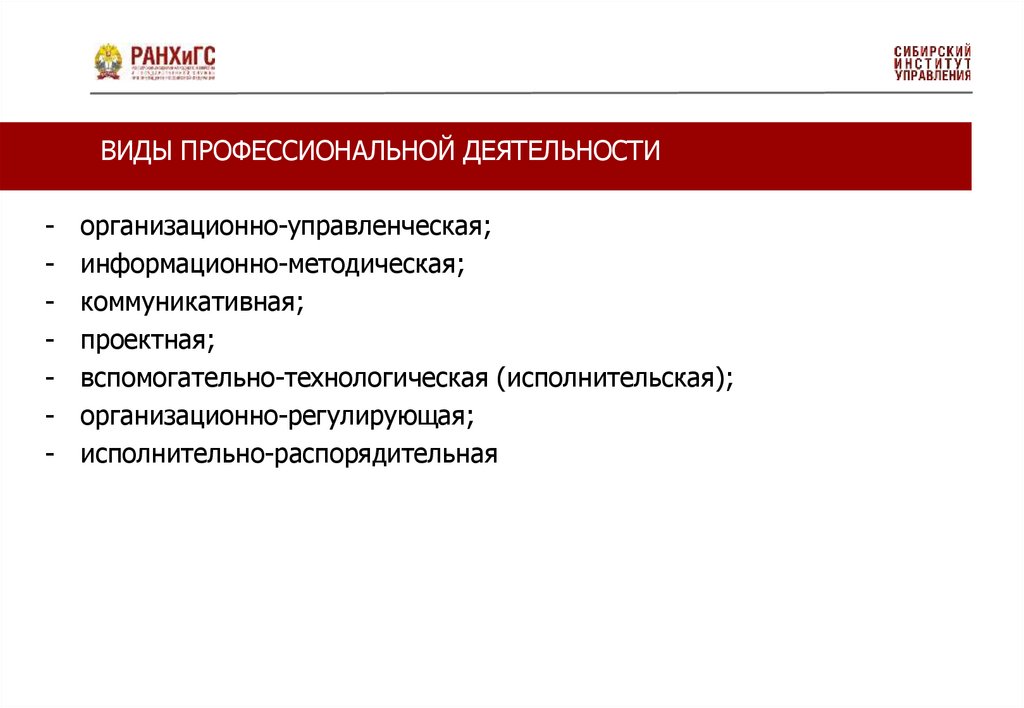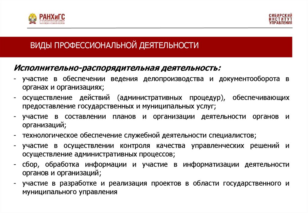 ВИДЫ ПРОФЕССИОНАЛЬНОЙ ДЕЯТЕЛЬНОСТИИсполнительно-распорядительная деятельность: