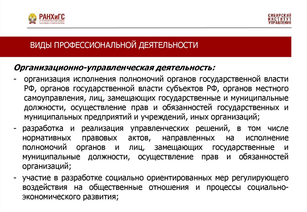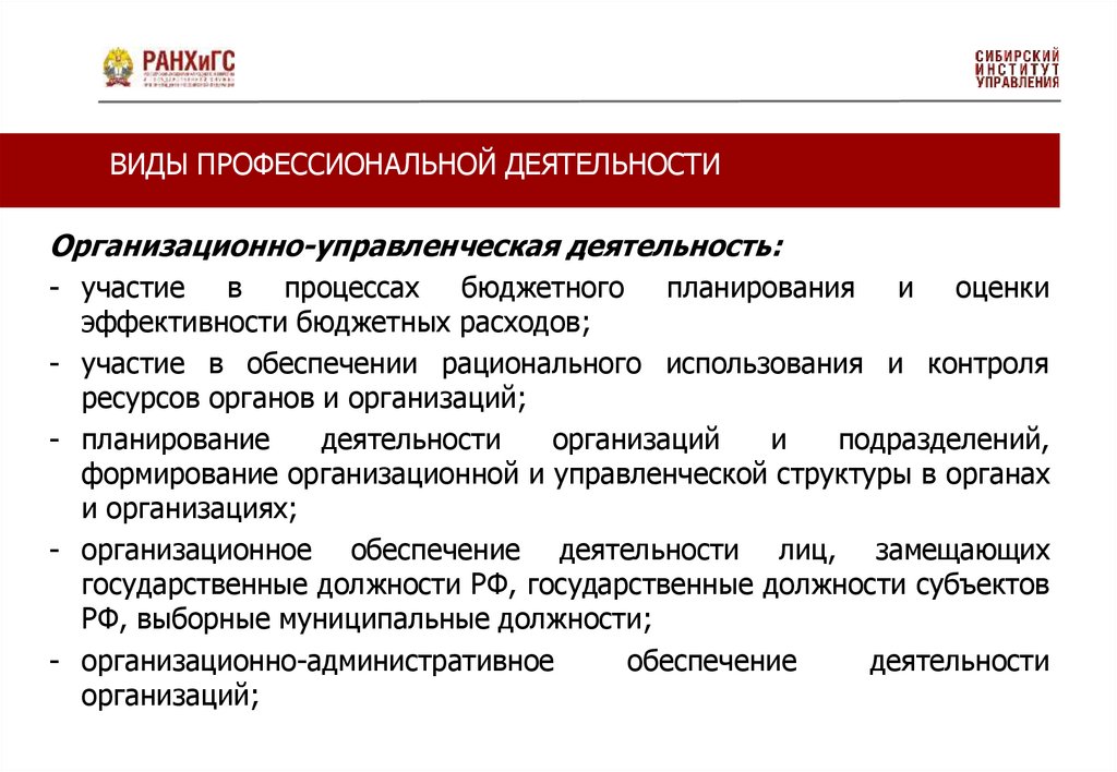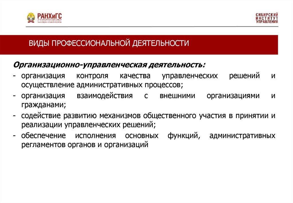 ВИДЫ ПРОФЕССИОНАЛЬНОЙ ДЕЯТЕЛЬНОСТИОрганизационно-управленческая деятельность: