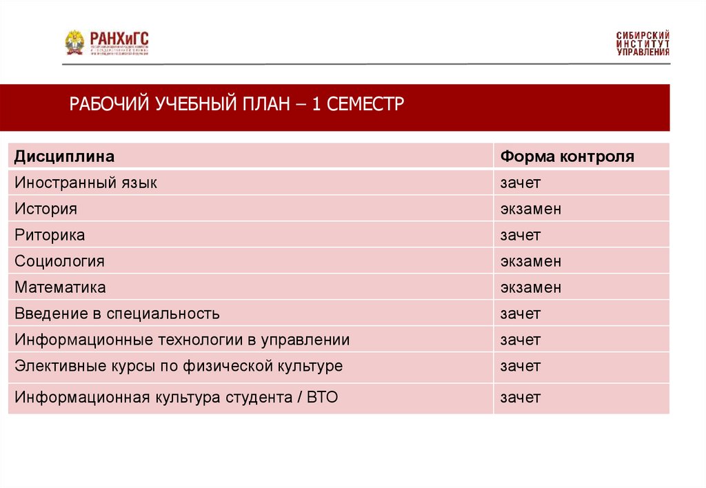 РАБОЧИЙ УЧЕБНЫЙ ПЛАН – 1 СЕМЕСТРДисциплина