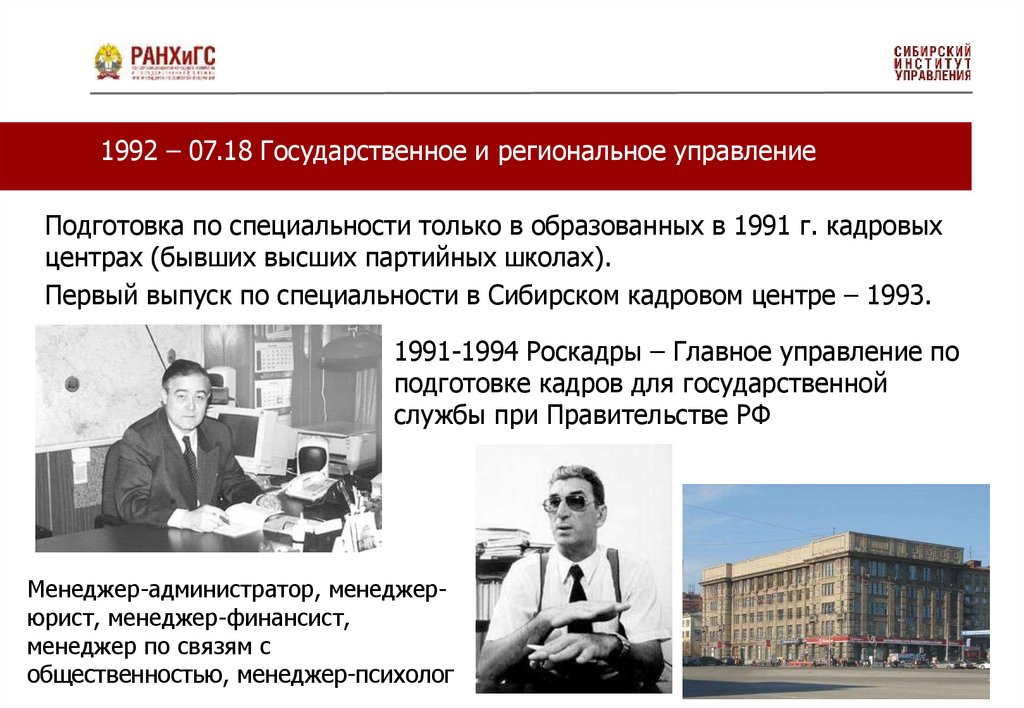 1992 – 07.18 Государственное и региональное управлениеПодготовка по специальности только в образованных в 1991 г. кадровых