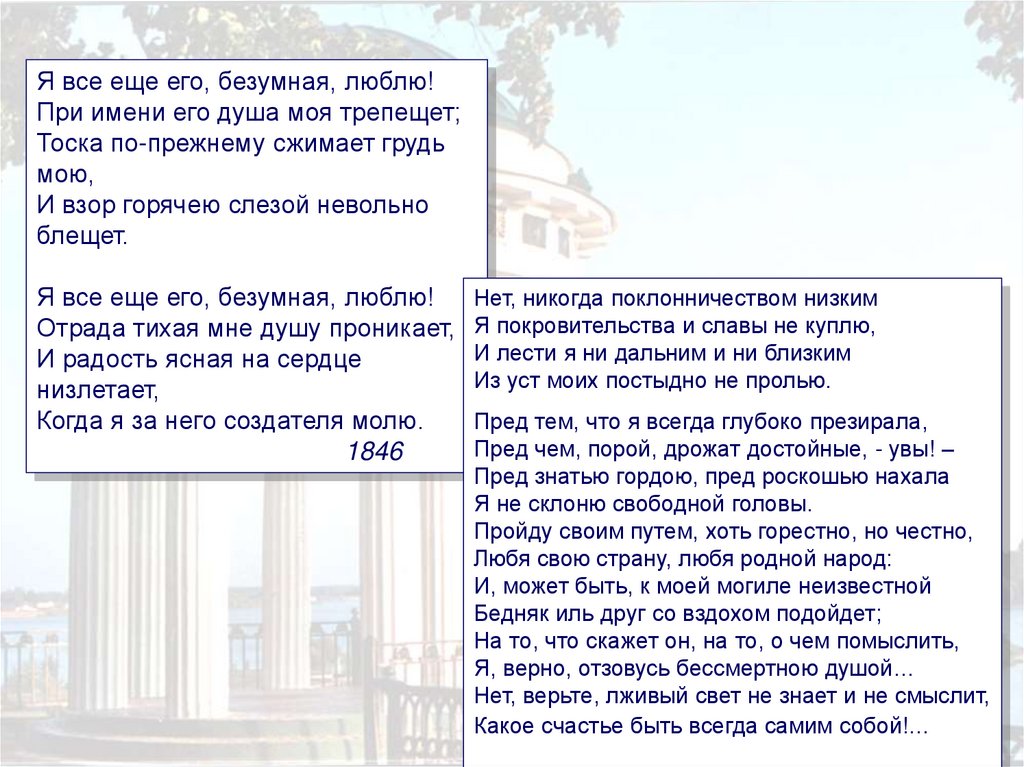 Я все еще его, безумная, люблю!При имени его душа моя трепещет;