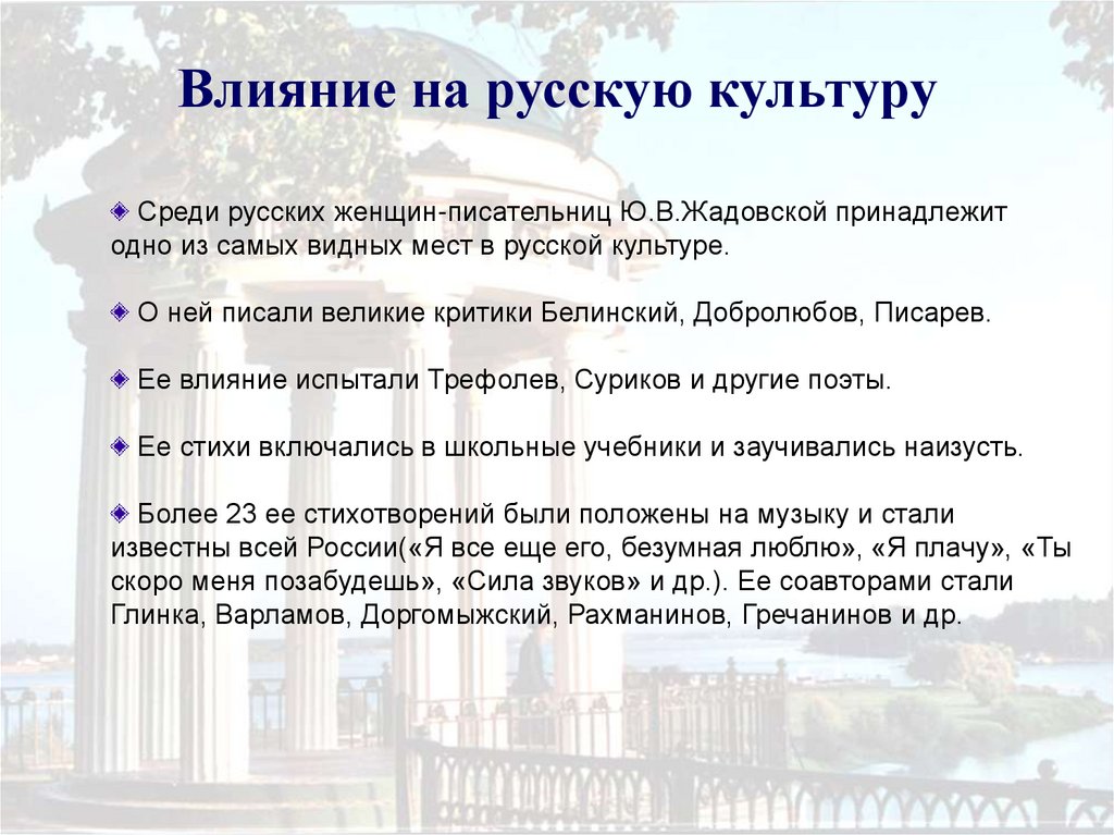 Влияние на русскую культуруСреди русских женщин-писательниц Ю.В.Жадовской принадлежит