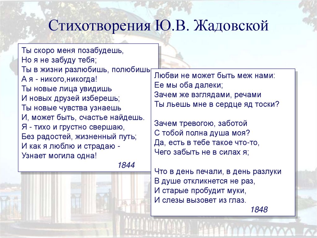Стихотворения Ю.В. ЖадовскойТы скоро меня позабудешь,