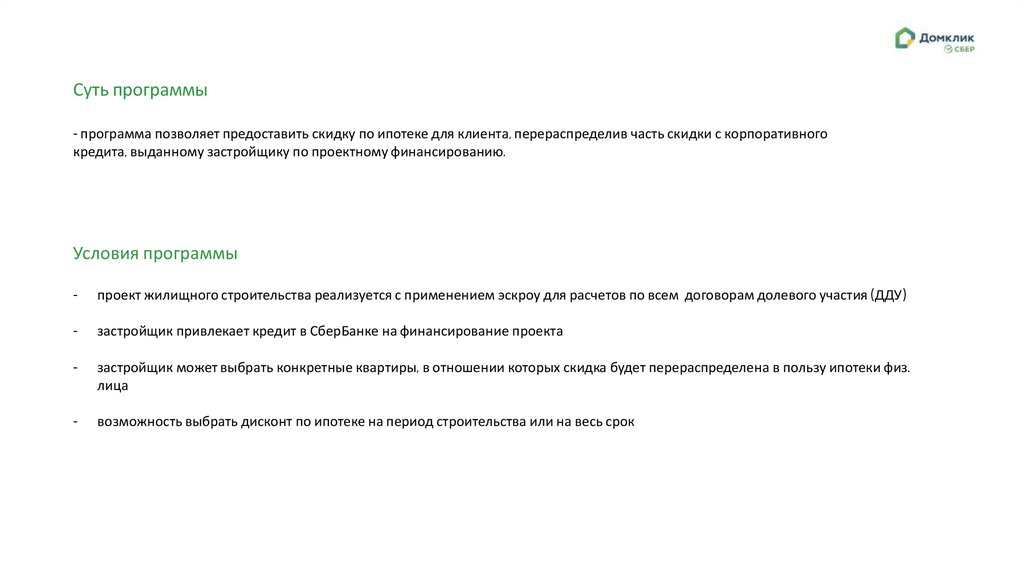 Суть программы- программа позволяет предоставить скидку по ипотеке для клиента, перераспределив часть скидки с корпоративного