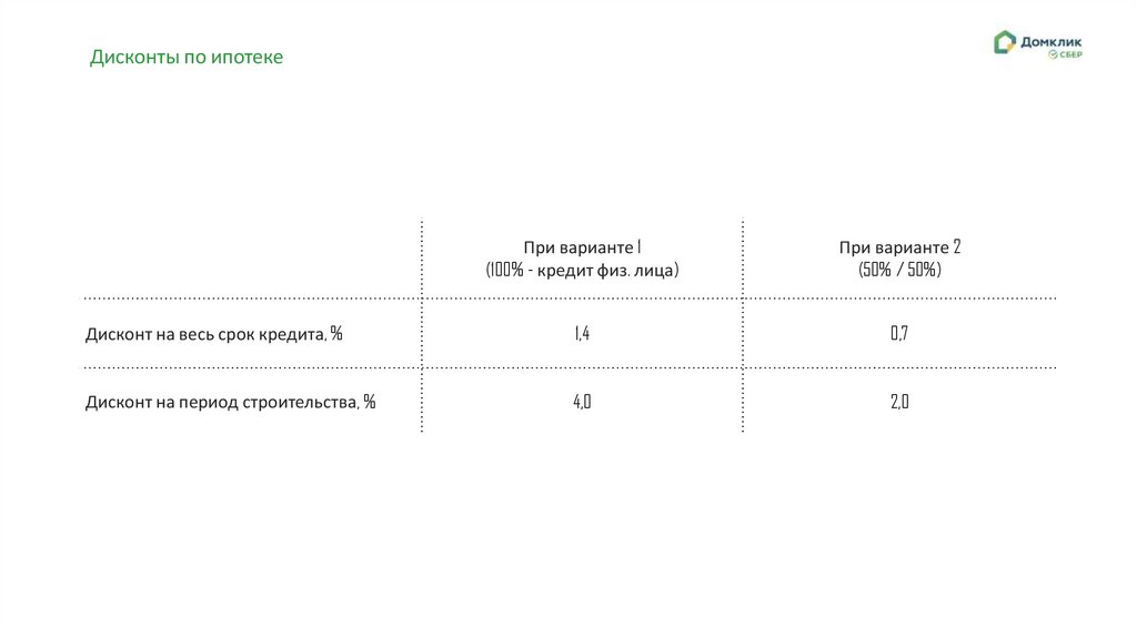 возможность выбрать дисконт по ипотеке на период строительства или на весь срок