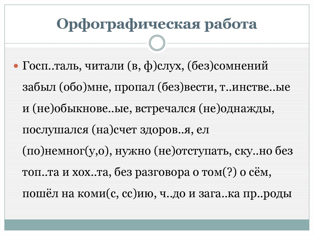 Орфографическая работаГосп..таль, читали (в, ф)слух, (без)сомнений