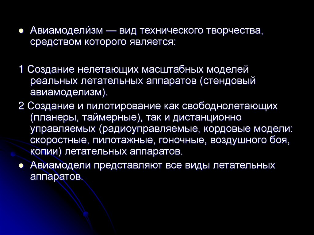 Авиамодели́зм — вид технического творчества,средством которого является: