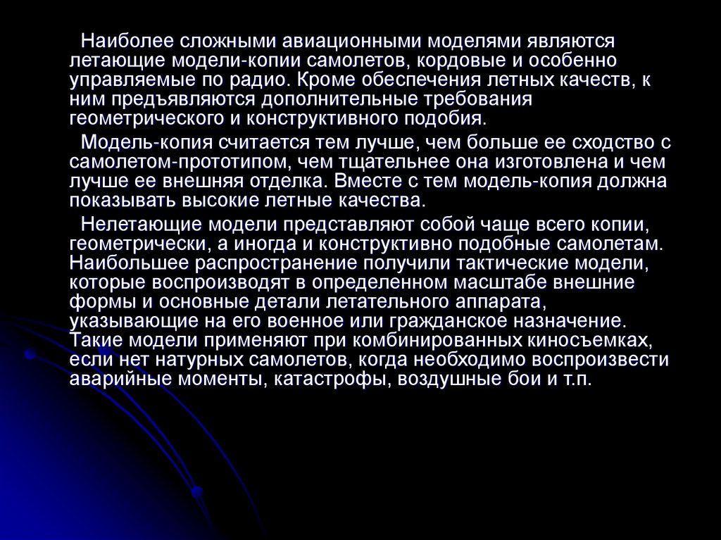 Наиболее сложными авиационными моделями являютсялетающие модели-копии самолетов, кордовые и особенно